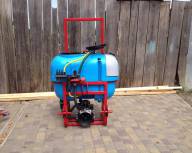 Обприскувач навісний ємкістю 600 літрів шириною крил 12 або 14 метрів. Колір бочки оприскувача синій.