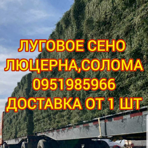 Хозяйство предлагает высококачественное сено этого года покоса. Луговое, люцерну, солому в тюках. Доставка по Украине. Минимальная партия к продаже за раз 400/500/700шт ( в зависимости от области). Форма оплаты: б/н расчёт. Цена договорная. Большие объёмы. Быстрая доставка. На рынке более 12 лет (производитель). Обращайтесь.
