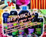"ВЕРМІСОЛ" – органічний, екологічно чистий, високоефективний регулятор росту та розвитку рослин, виробляється з біогумусу за ТУУ 15.2-2336711650.001-2003, містить в розчиненому стані гумати, амінокислоти, вітаміни, природні фітогармони, мікро- та макроелементи, азот, калій, магній, кальцій, фосфор, бор, спори грунтових мікроорганізмів та ін.