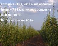 Продажа действующего сельхозпредприятия в 35 км от Одессы. Территория 92 га. Из них: выращивание клубники 8 га, капельное орошение; груша 7,5 га, капельное орошение; персик 10 га; пахотные земли - 65г а. Сады заложены в 2008 г. В стоимость пакета бизнеса входит: техника и оборудование для работы; холодильные камеры и склады для хранения продукции, новая административно бытовая часть со всеми условиями для проживания персонала и офисной частью; торговая марка и налаженный сбыт продукции.