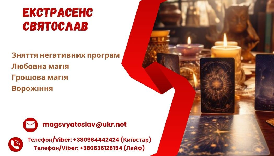 Екстрасенс Святослав також проводить діагностику за допомогою карт Таро, допомагає знайти відповіді на важливі питання, передбачити майбутнє і розібратися в поточних проблемах. Якщо вам потрібно позбутися залежностей або змінити свою долю, він запропонує відповідний ритуал для звільнення від руйнівних звичок і залучення удачі.