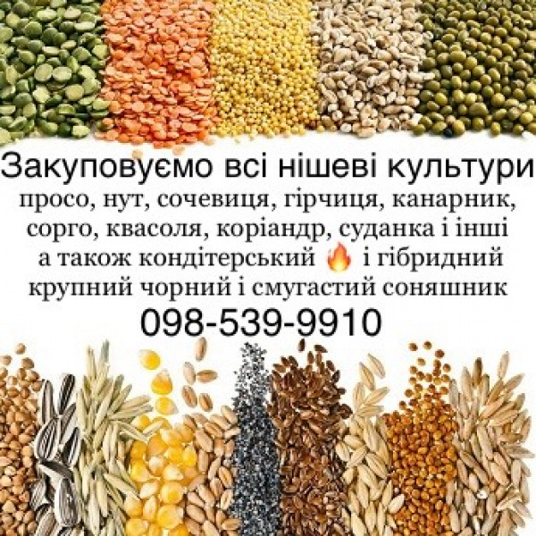 Також купуємо нішеві культури (льон, коріандр, сочевиця, просо, нут, овес та інші)