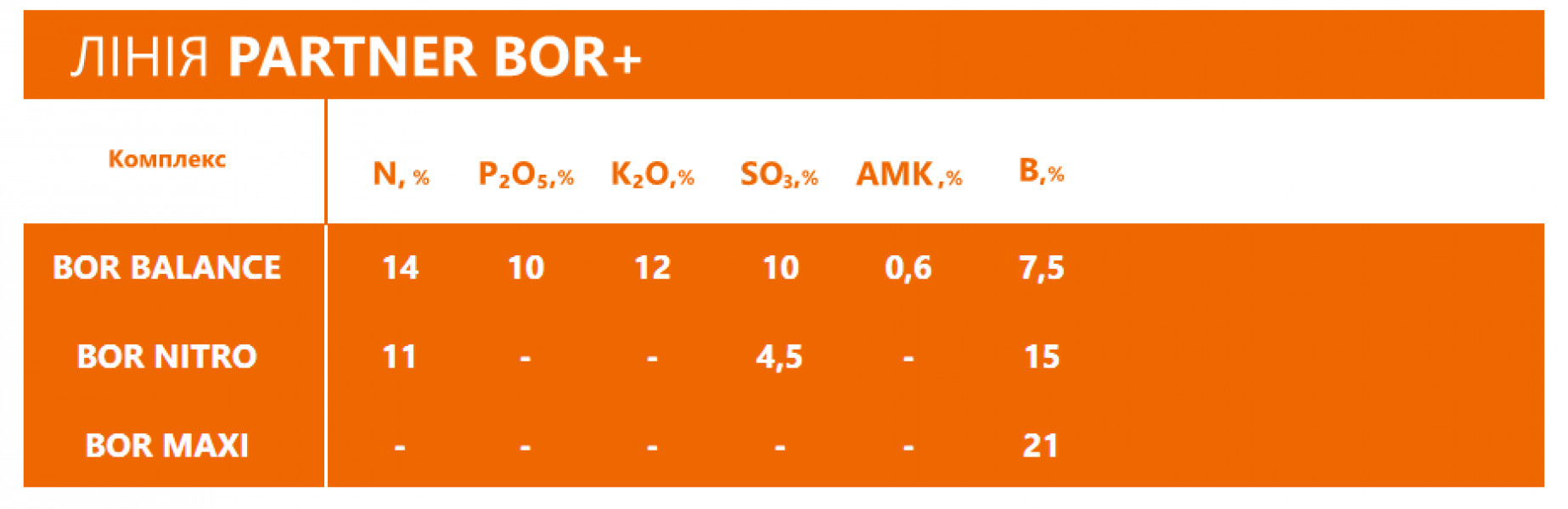 - PARTNER BOR - спеціалізована лінія добрив, до якої входять три продукти, що містять високоякісний швидкий БОР. Добрива цієї лінії повністю розчинні у воді, технологічно зручні у застосуванні та відрізняються високою концентрацією бору. /