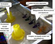 бункерные кормушки две штуки каждая на 1 кг сыпучего корма; микро поилки для выпаивания суточных перепелов;