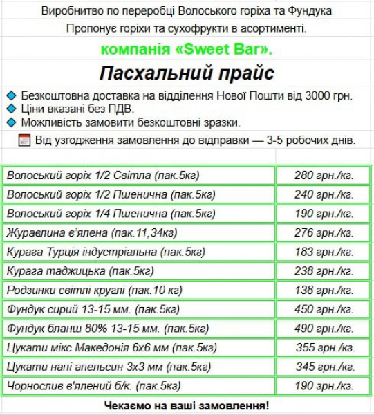 Горіхи, сухофрукти в асортименті. Пасхальний прайс